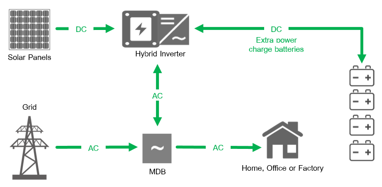Hybrid Solar System operates in both conditions(presence/absence of main grid). Hybrid inverter has ability to decide when to connect/disconnect from the grid and when to charge/discharge the batteries.